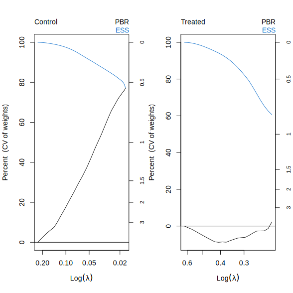 Recall that \(\lambda^{\max}\) corresponds to the intercept-only (unweighted) fit. As \(\lambda\) decreases, covariate imbalance is reduced, but at the cost of a smaller effective sample size, reflecting increased concentration of weights on a subset of units.