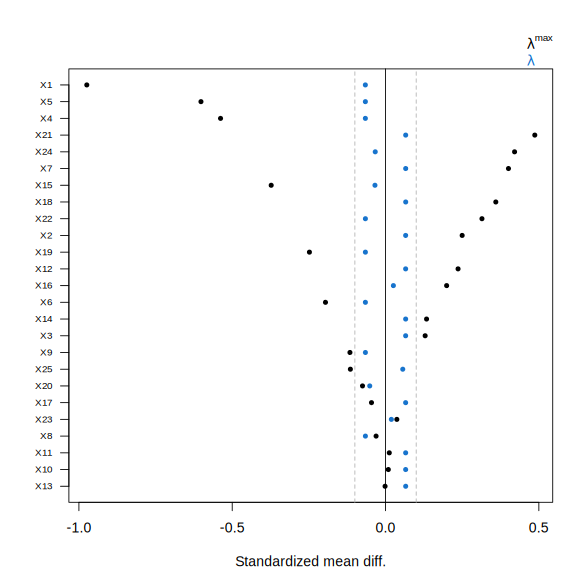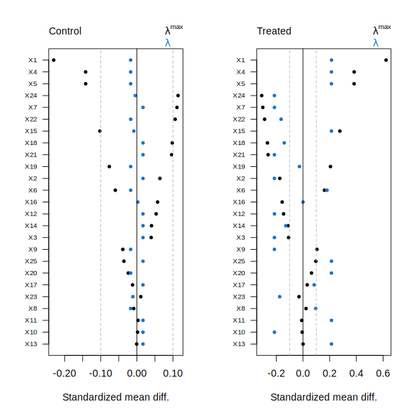 To illustrate this, consider \(\lambda^{\max} \approx 0.62\) for the treated arm in the printed output. This value corresponds to the imbalance in the unweighted treatment arm data and can be verified directly: