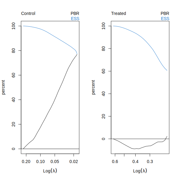 In this simulated example, it is not possible to find weights that exactly balance the treated and control covariate means to the overall sample means of \(X\). As a result, for both treatment arms the regularization path is truncated before reaching the default path length of nlambda = 100. The treated arm, in particular, is more difficult to balance.